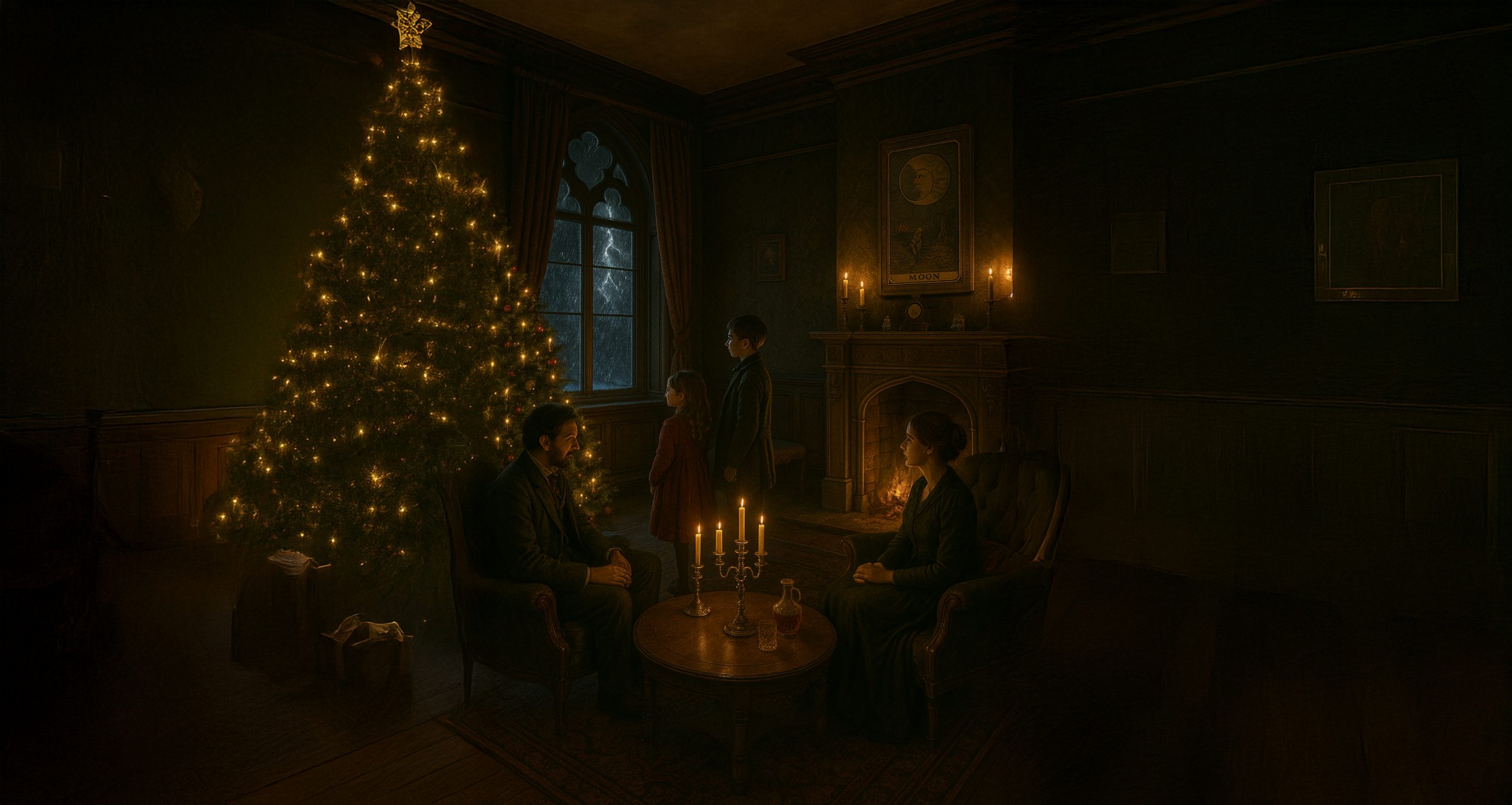 Vers 18 h 30, alors que tout le monde se trouvait au grand salon pour l’apéritif, une tempête très violente a éclaté, accompagnée d’un orage. Un éclair est tombé sur le vieux hêtre, le fendant en deux : depuis la baie vitrée, vous l’avez vu arracher le câble électrique alimentant tout le manoir en tombant. Geneviève, l’intendante, est entrée dans le grand salon avec un chandelier et une mauvaise nouvelle : l’électricité est coupée ainsi que le téléphone. Elle a même essayé le téléphone portable, mais la tempête a dû endommager l’antenne relais la plus proche. De plus, la pluie tombe à verse, rendant les routes impraticables. Vous êtes coupés du monde…